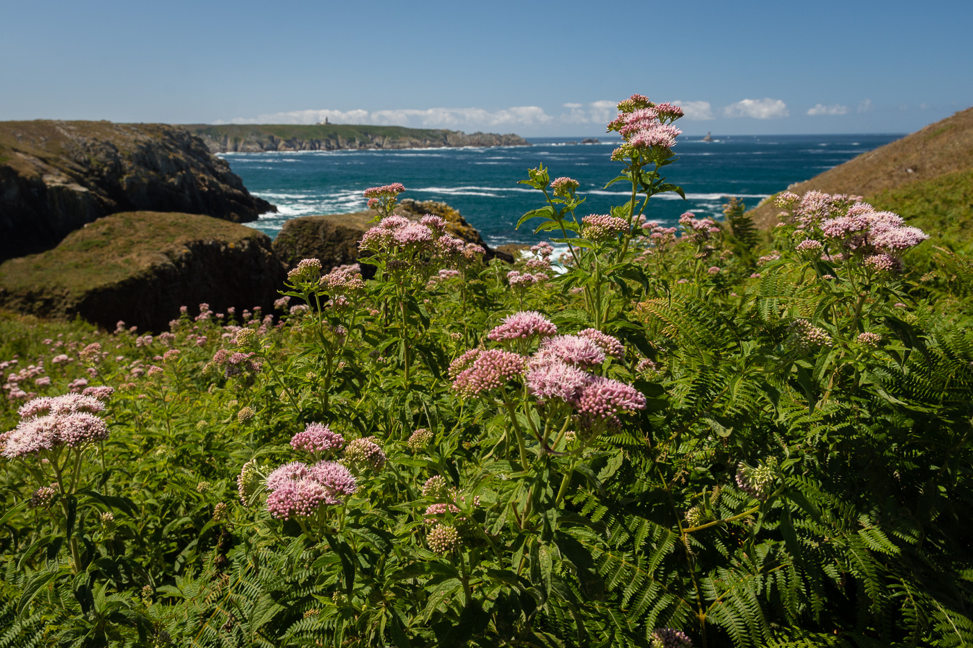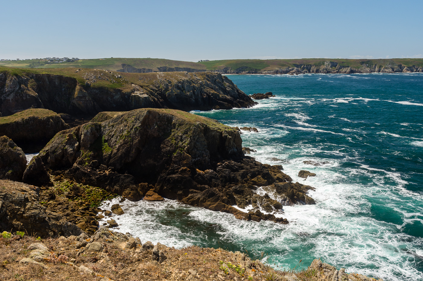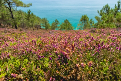 Nouvelle étape du jour : le cap de la chèvre, plus au sud. Très touristique, cependant en faisant quelques mètres sur le sentier, il y a déjà moins de monde. Les falaises et les bruyères en fleurs sont à nouveau présentes. Il fait tellement beau (oui, oui, nous sommes bien en Bretagne !) que la pointe du Raz et la pointe de Pen-Hir sont visibles.