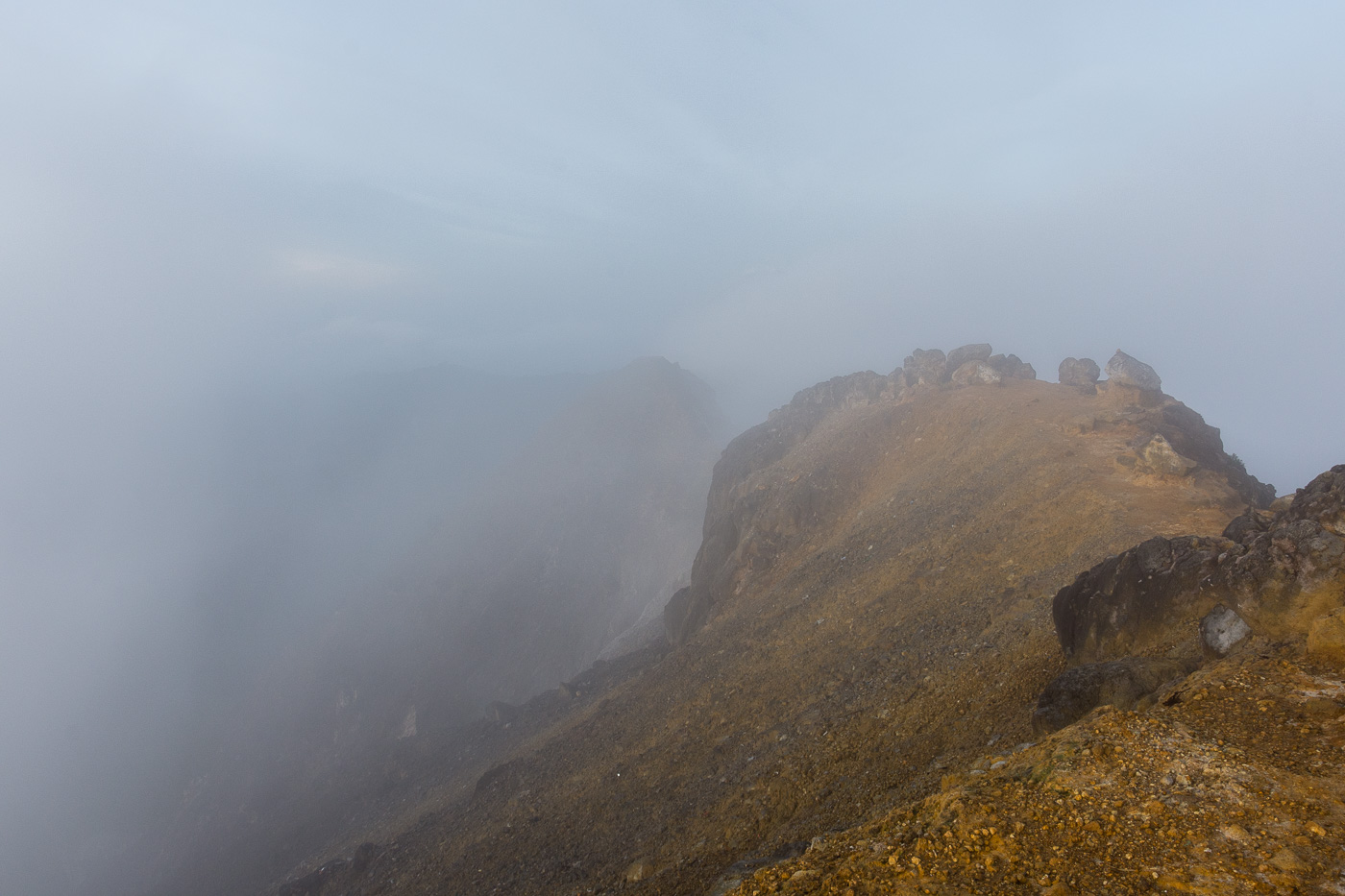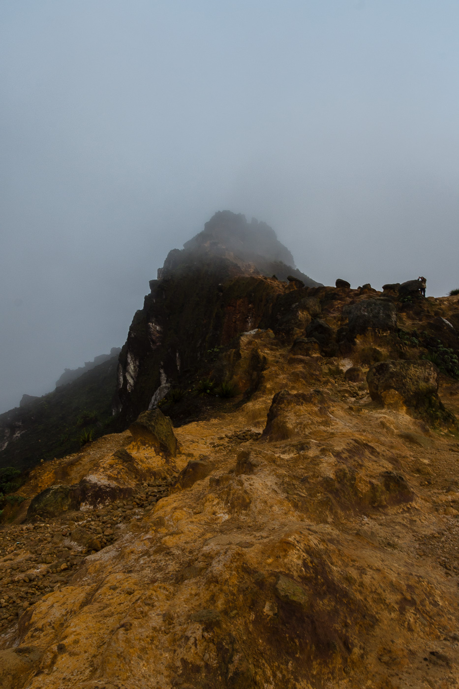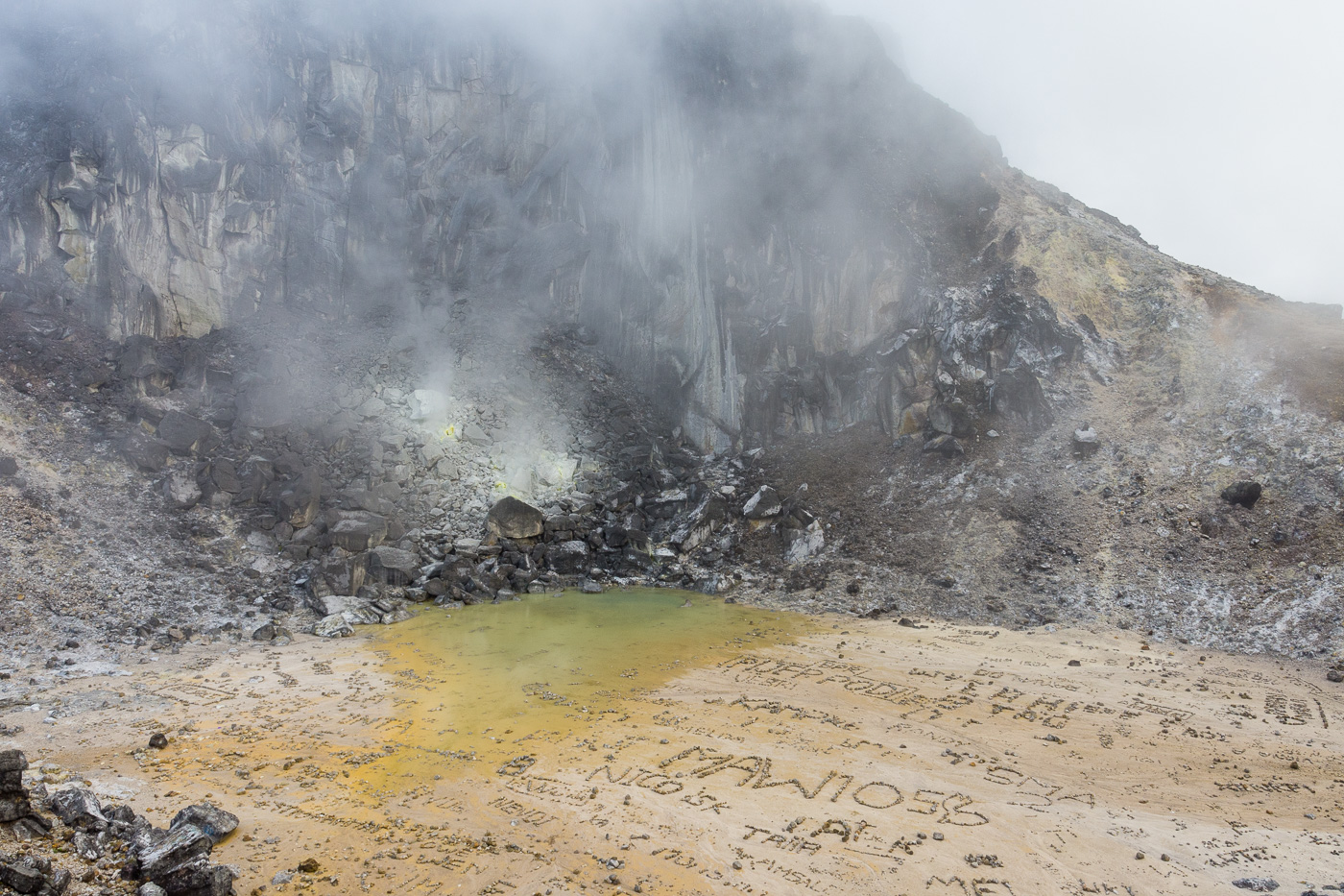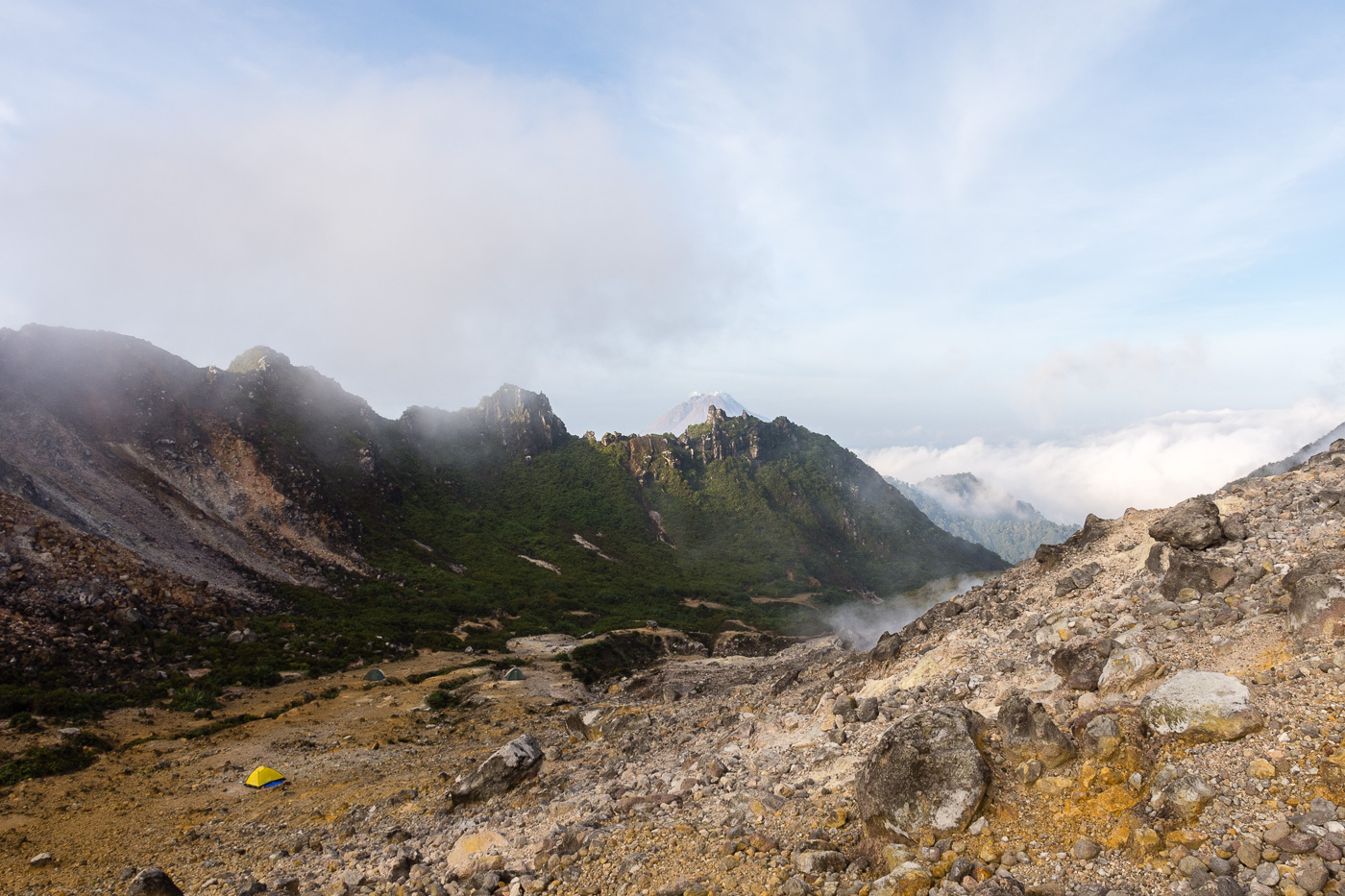 Le ciel restant nuageux, nous ne pouvons pas admirer le panorama sur la ville de Berastagi, ni sur le volcan Sinabung au loin. Alors, nous descendons observer les fumerolles de soufre dans le cratère : l’odeur d’oeuf pourri est vraiment forte. La vapeur s’échappe du sol par des fissures jaunes. Les pierres alentours sont toutes chaudes : on sent que ça bouillonne là-dessous !