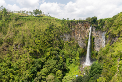 Une heure plus tard, nous faisons un autre arrêt au point de vue sur la cascade Sipiso-Piso et le lac Toba. Cette cascade de 120m est la plus haute d’Indonésie. Elle est issue d’une rivière souterraine et se déverse dans le lac. Nous descendons pour nous approcher un peu. Même loin du bassin le bruit est déjà assourdissant ! La végétation autour de la chute est luxuriante : quel beau décor !